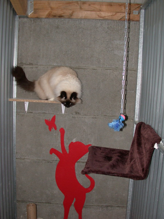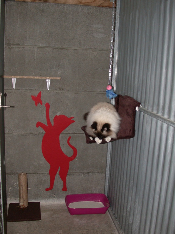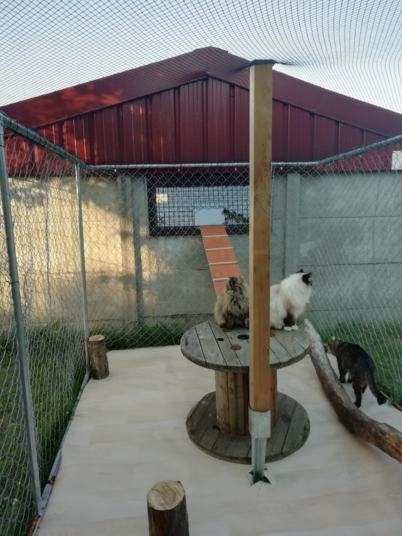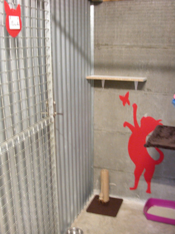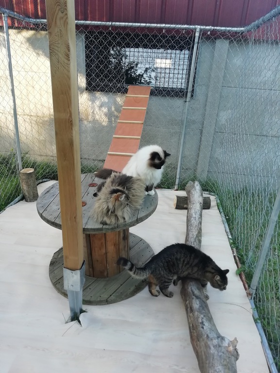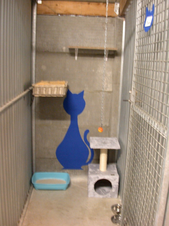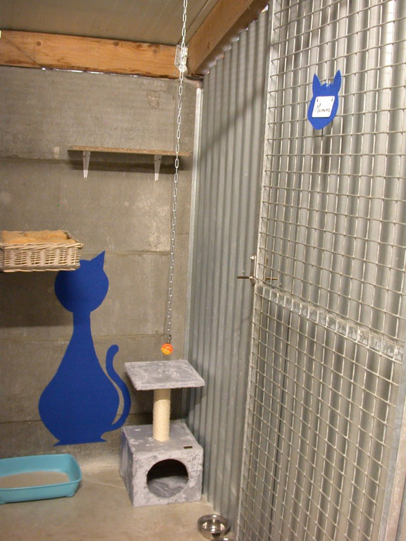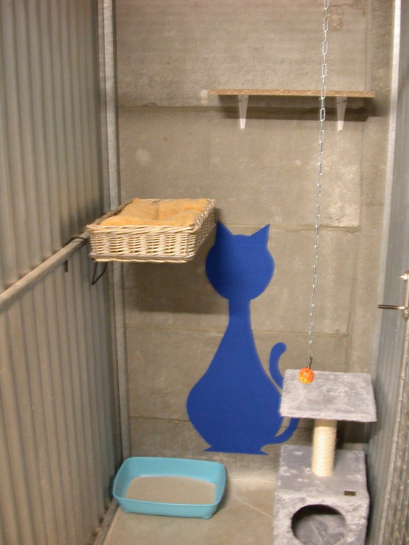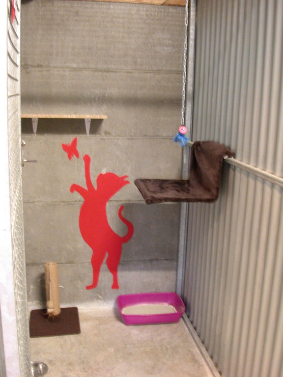 Les box sont aménagés de transat, coussin, étagère, arbre à chat, panier, tabouret......